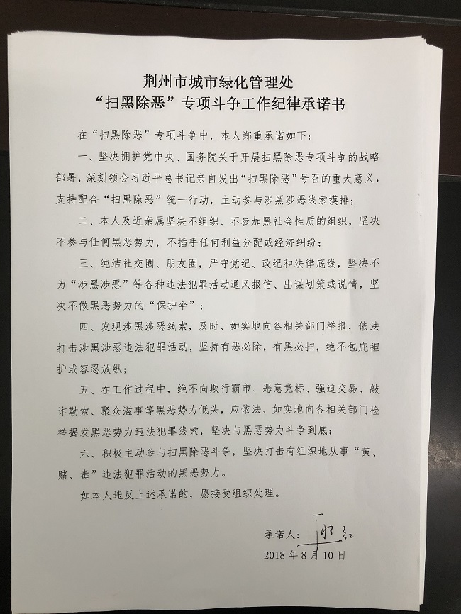 之后,黨員同志們圍繞“掃黑除惡、勇當(dāng)先鋒”主題開展了討論,進(jìn)一步統(tǒng)一了思想認(rèn)識(shí),紀(jì)律意識(shí)、規(guī)矩意識(shí)、責(zé)任意識(shí)得到強(qiáng)化,為堅(jiān)決打贏掃黑除惡專項(xiàng)斗爭(zhēng)攻堅(jiān)戰(zhàn)提供了思想和紀(jì)律保障。 最后,綠化處全體黨員同志簽訂了《“掃黑除惡”專項(xiàng)斗爭(zhēng)工作紀(jì)律承諾書》?!冻兄Z書》從6個(gè)方面規(guī)定了掃黑除惡工作中需要遵守的紀(jì)律,要求全體干部職工自覺投身掃黑除惡專項(xiàng)斗爭(zhēng),積極配合做好掃黑除惡專項(xiàng)斗爭(zhēng),以身作則,帶頭遠(yuǎn)離黑惡勢(shì)力,并對(duì)發(fā)現(xiàn)和掌握的涉黑涉惡違法犯罪及苗頭,及時(shí)向單位舉報(bào)。同志們紛紛表示,要切實(shí)履行承諾,筑牢防線、不踩紅線、守住底線,本著對(duì)組織、對(duì)家庭負(fù)責(zé)的態(tài)度,嚴(yán)格要求自己,勇于擔(dān)當(dāng)、敢于碰硬,自覺同黑惡勢(shì)力做斗爭(zhēng),發(fā)揮先鋒模范作用,推動(dòng)綠化處“掃黑除惡、勇當(dāng)先鋒”專項(xiàng)斗爭(zhēng)工作向縱深發(fā)展。
