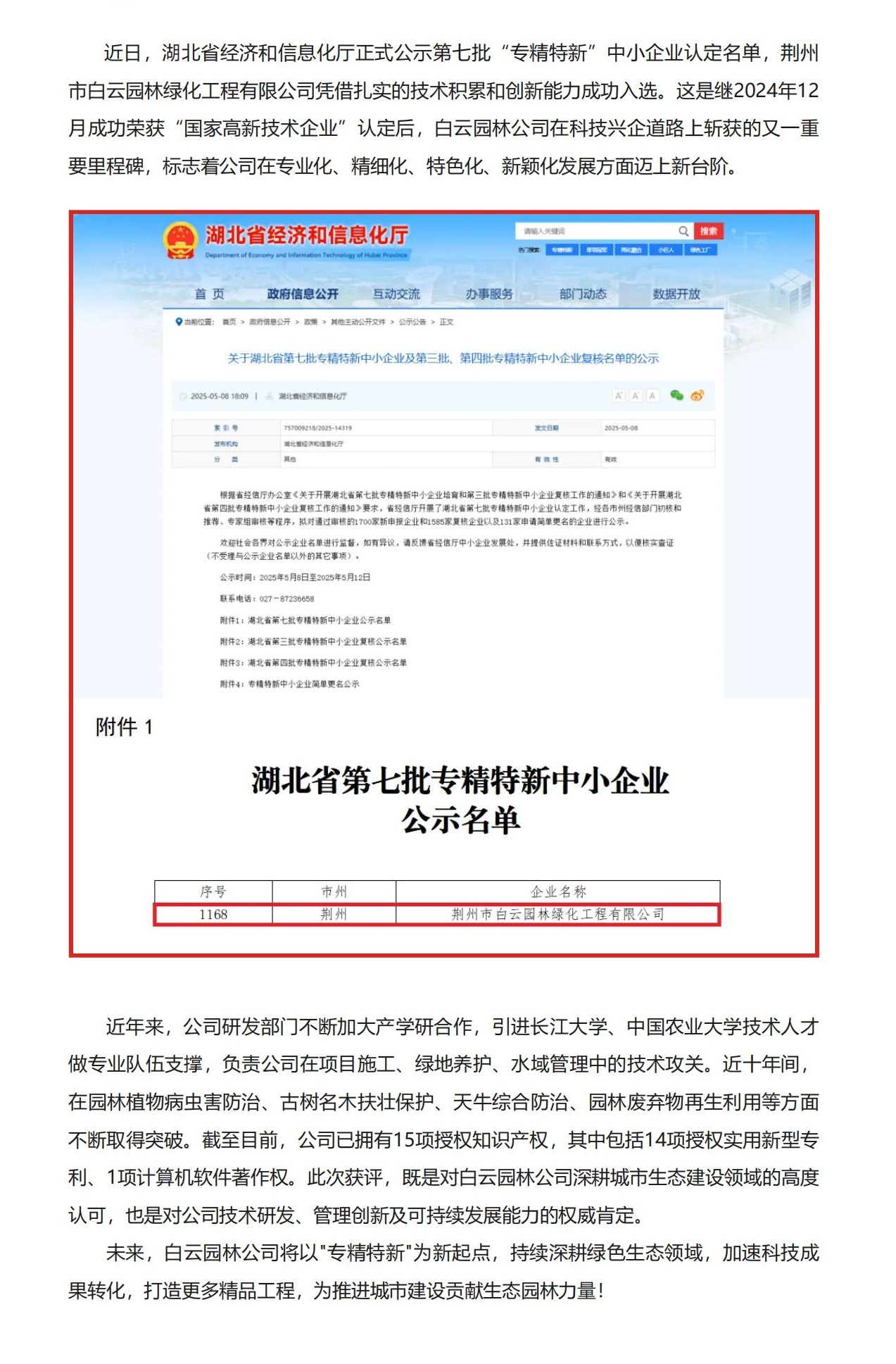 喜報(bào)丨白云園林公司成功獲湖北省“專精特新”中小企業(yè)認(rèn)定